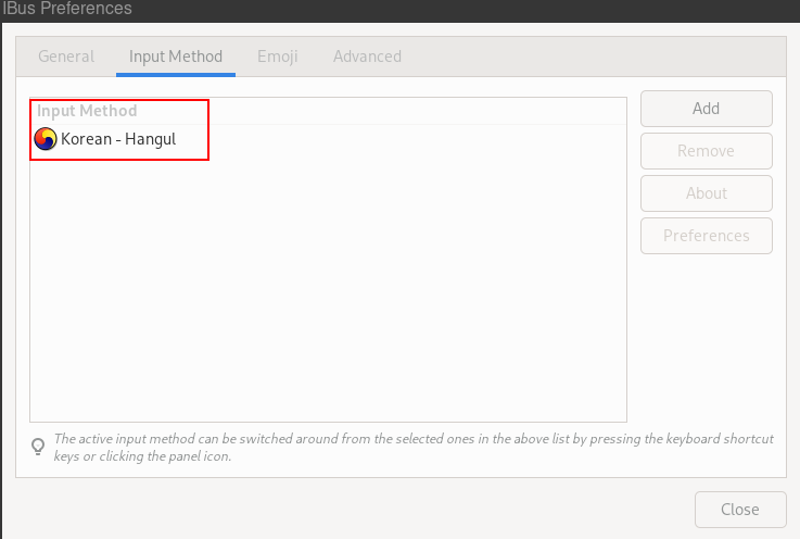 ibus의 경우 다음의 그림에서처럼 add 버튼을 눌러 Hangul로 검색되는 키보드를 추가해주고 영어 키보드는 제거한다.