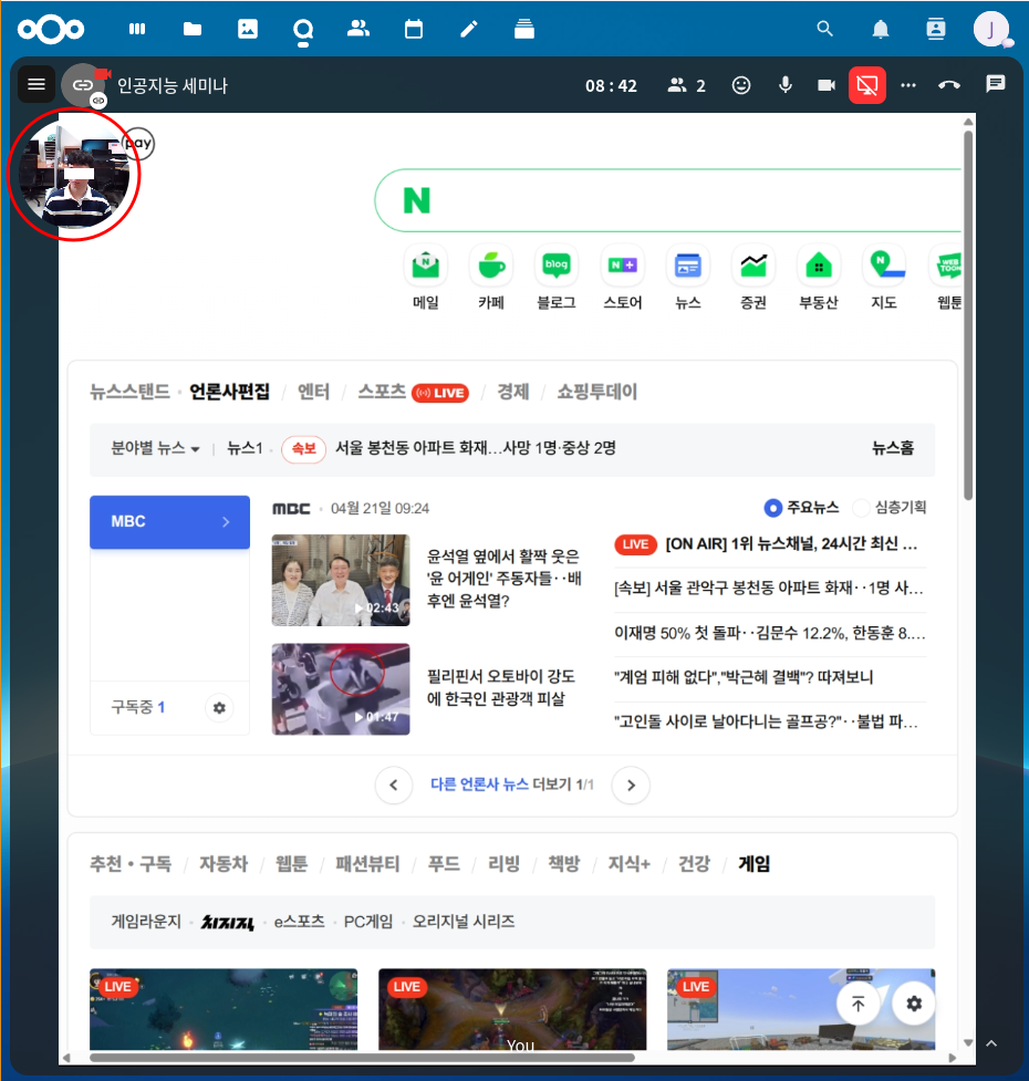 그러면 공유한 화면이 나와 참가자들에게 함께 나타나고, 나의 얼굴은 작게 원으로 함께 표시된다. 이제 공유한 화면을 보면서 회의를 진행하면 되겠다.